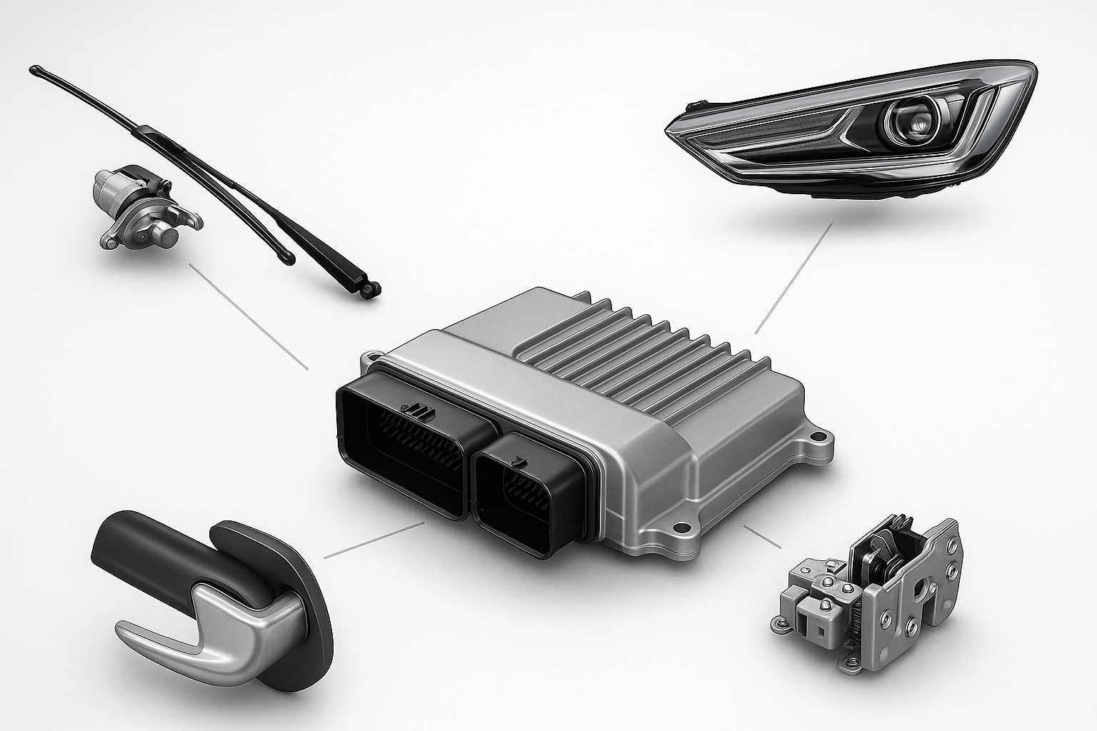 Multifunction control ECU managing wipers, lighting, locking, and trailer detection features.
